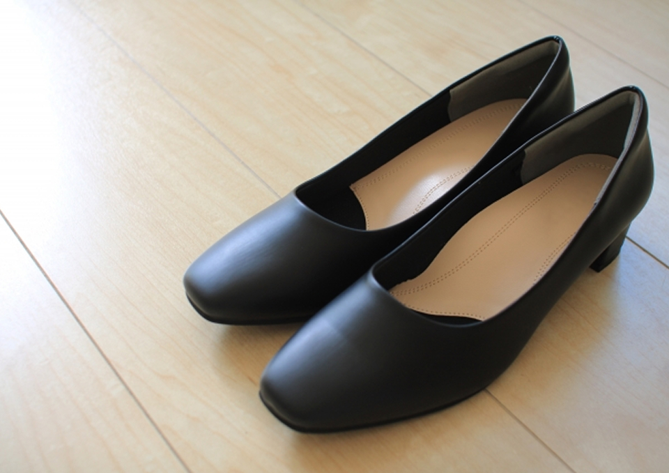 男性は、つま先に飾りのない黒の紐革靴が安心です。ひも穴部分が外に出ない作り(内羽根)だとより礼節に沿います。女性は、つま先がしっかり覆われ、かかとが露出しない黒の靴が無難です。かかとは低めから中くらいで安定する高さを選びます。